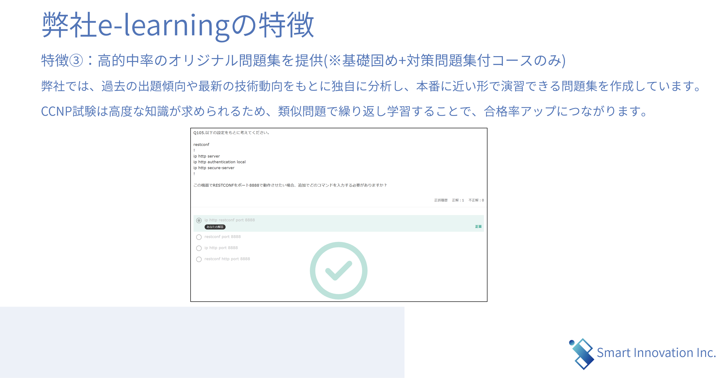 弊社では、過去の出題傾向や最新の技術動向をもとに独自に分析し、本番に近い形で演習できる問題集を作成しています。CCNP試験は高度な知識が求められるため、類似問題で繰り返し学習することで、合格率アップにつながります。